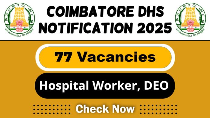 DHS Coimbatore Recruitment 2025: The District Health Office, Coimbatore (DHS Coimbatore) is now inviting offline applications from qualified and interested candidates to fill the 77 Multi-purpose Hospital Worker, DEO Job Vacancy 2025. The selected candidates for the Multi-purpose Hospital Worker, DEO position would receive a monthly salary of ₹23,000/-.