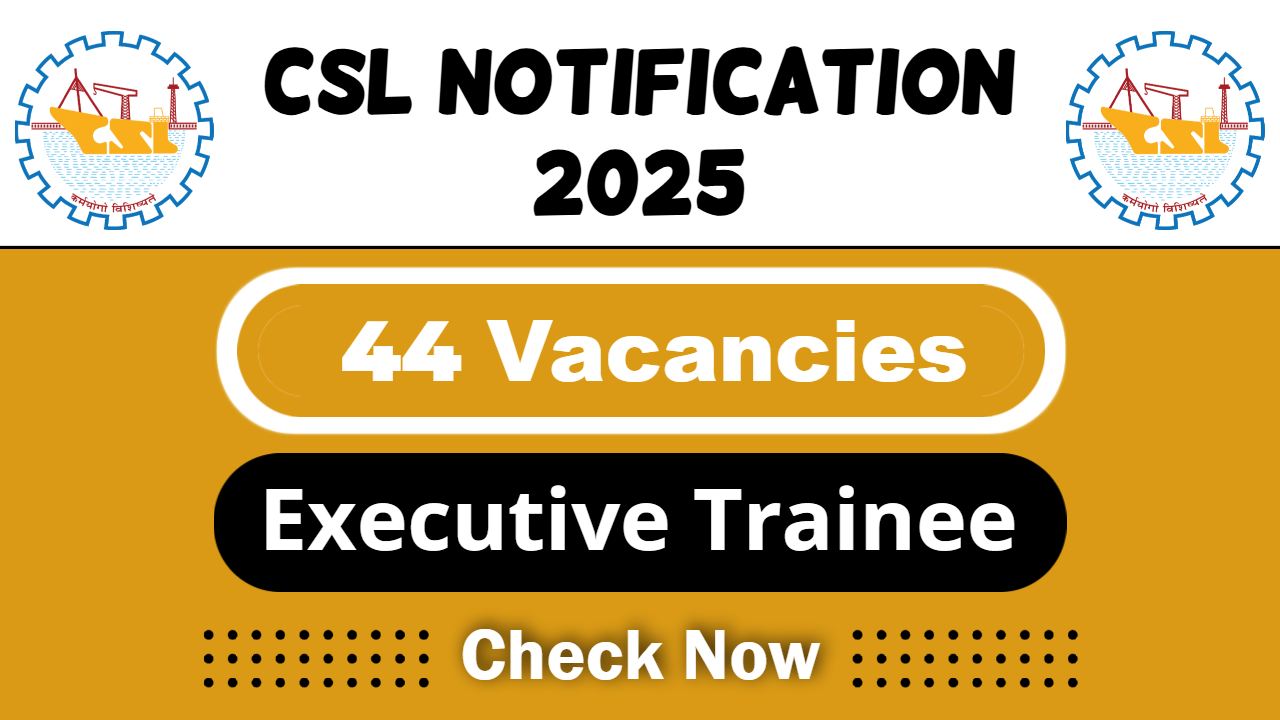 CSL Job Recruitment 2025 : The Cochin Shipyard Limited (CSL) has recently released 44 Executive Trainee Job Notification is available for download. The job Appointment will be on a Ref No. CSL/P&A/RECTT/PERMANENT/EXECUTIVE TRAINEE/2024 in Ernakulam, Kerala 682015. Check the latest CSL Executive Trainee job notification through the official website, https://cochinshipyard.in/, interested and qualified Job applicants can submit their CSL Job Recruitment 2025 application for Executive Trainee job vacancy 2025. Applicants between the ages of Shall be 27 years with the required education and experience have an opportunity to apply.