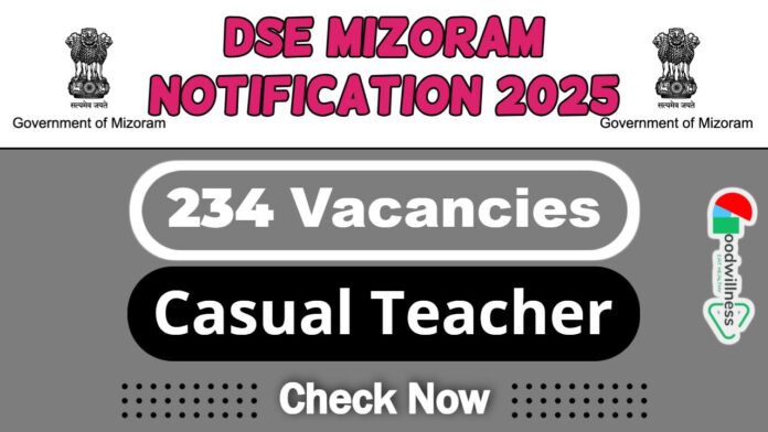 Directorate of Secondary Education Mizoram Job 2025 | DSE Mizoram Invites 234 Casual Teacher Vacancy | DSE Mizoram has recruit HSSLC with 2-year Diploma in Elementary Education candidates for Casual Teacher Post | Apply Now | www.goodwillness.com